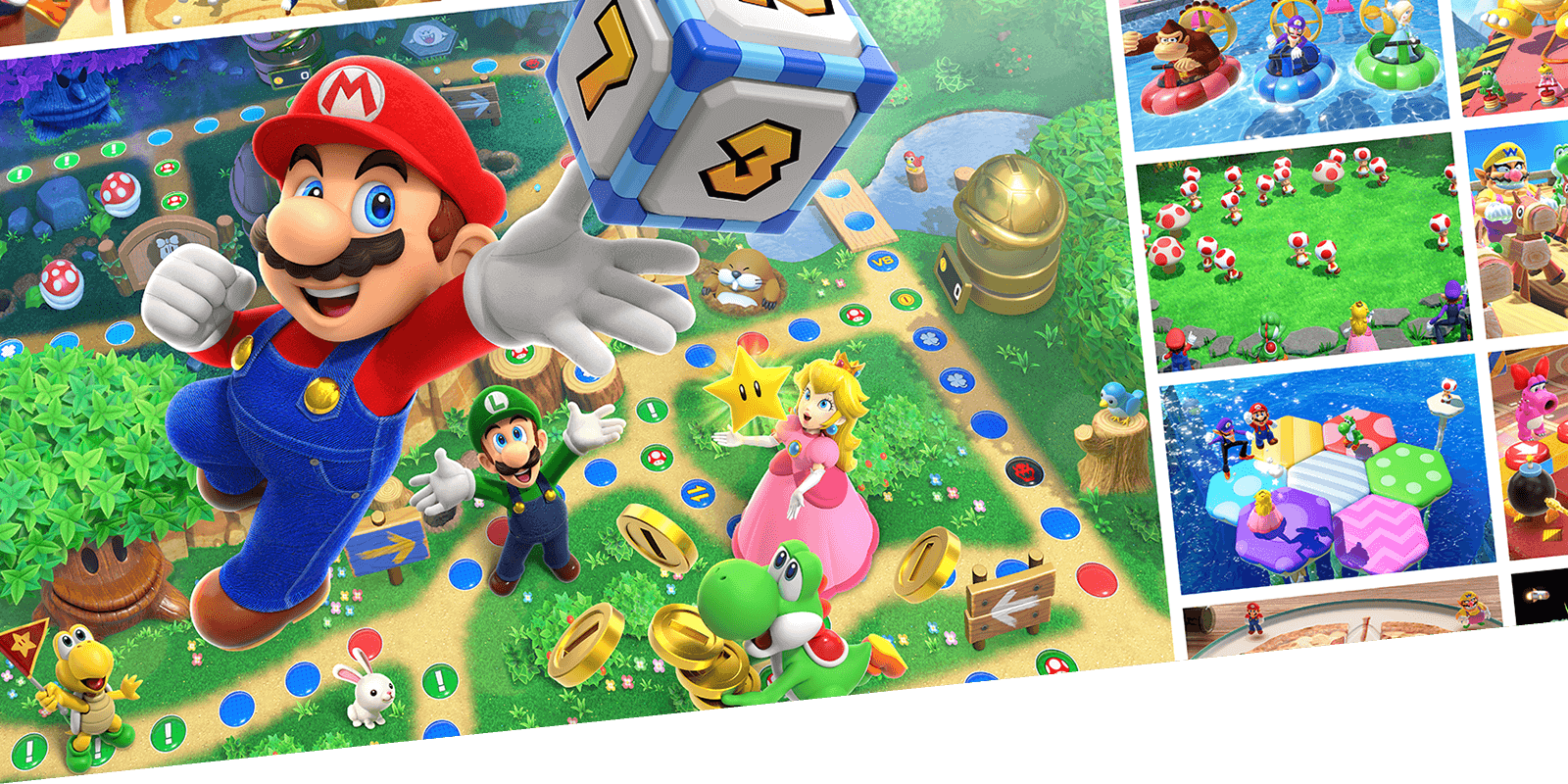 코인을 얻어 스타를 구입하고 최종적으로 가장 많은 스타를 얻은 사람이 우승하는 ‘주사위 놀이’ - ‘마리오파티’ 1, 2, 3에서 엄선된 5가지 명작 보드맵을 풀 3D 그래픽으로 리메이크했다.